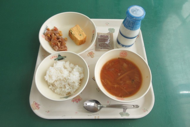 今日の献立は、ごはん、牛乳、かぼちゃのキムチ汁、ねぎ玉焼き、れんコーンきんぴら、ココア牛乳のもと です。