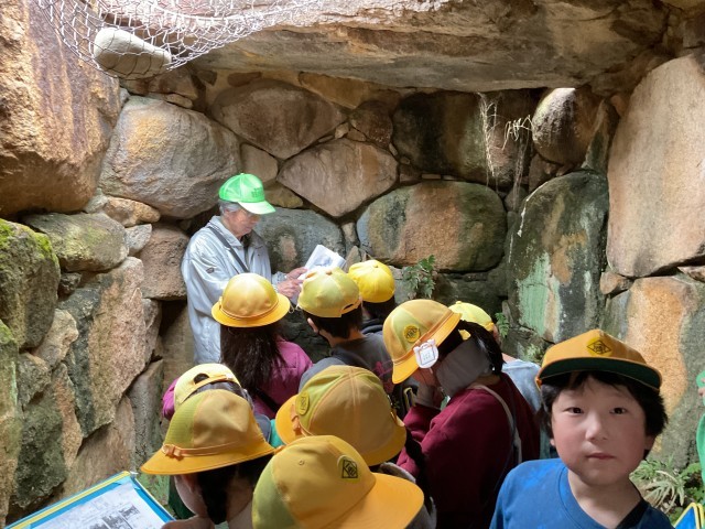 岩崎山に詳しい方に説明をしていただきながら、岩や古墳など貴重な郷土資料を見ることができました。