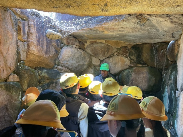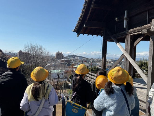 地域への理解を深め、愛着を育むことを目的に、岩崎山の見学に行きました。岩崎山に詳しい方のお話を通して、小牧山や名古屋城とのつながりや、受け継がれてきた伝統について学ぶことができました。