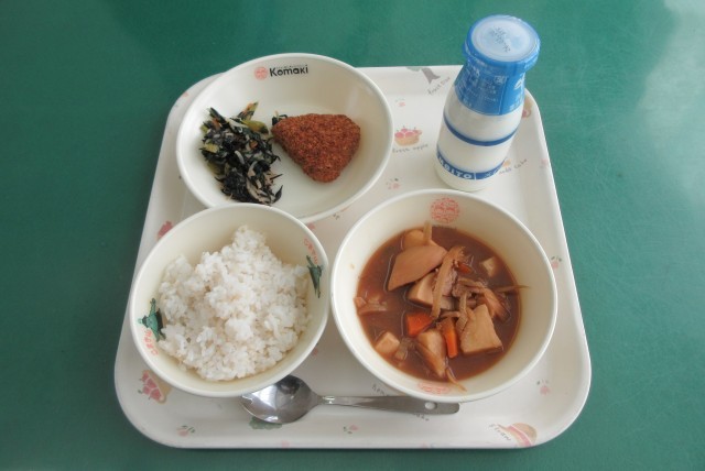 今日の献立は、麦ごはん、牛乳、具だくさん豚汁、かぼちゃのひき肉フライ、野菜とひじきのあえもの です。
