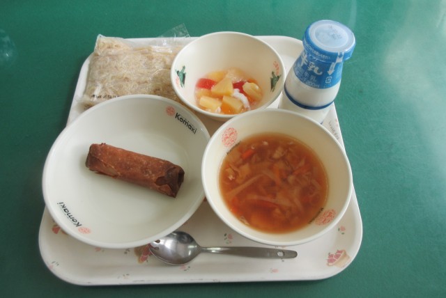 今日の献立は、中華めん、牛乳、しょうゆラーメン、愛知の野菜入り春巻き、杏仁豆腐 です。