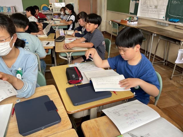 3組は国語です。「銀色の裏地」がスタートしました。相関図について教えてもらい、早速ノートにまとめていました。