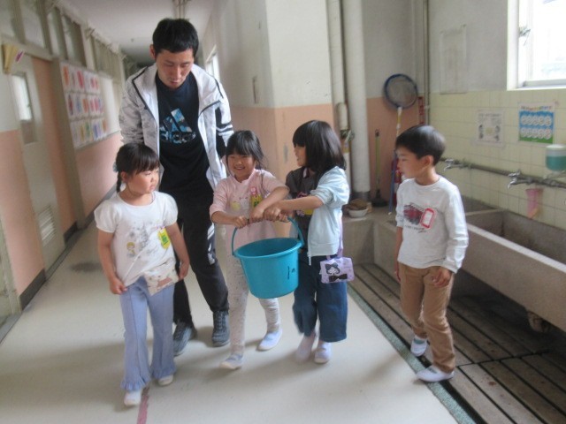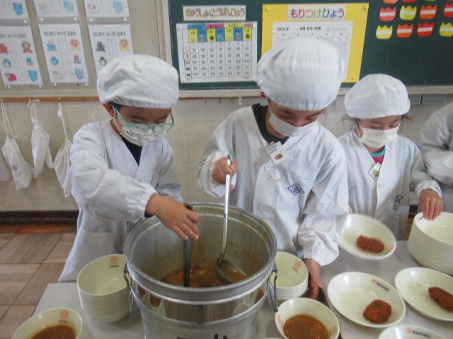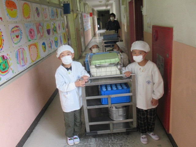 みんなで協力してワゴンを運び、机ふきの準備をして配膳しました。