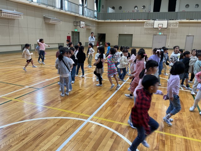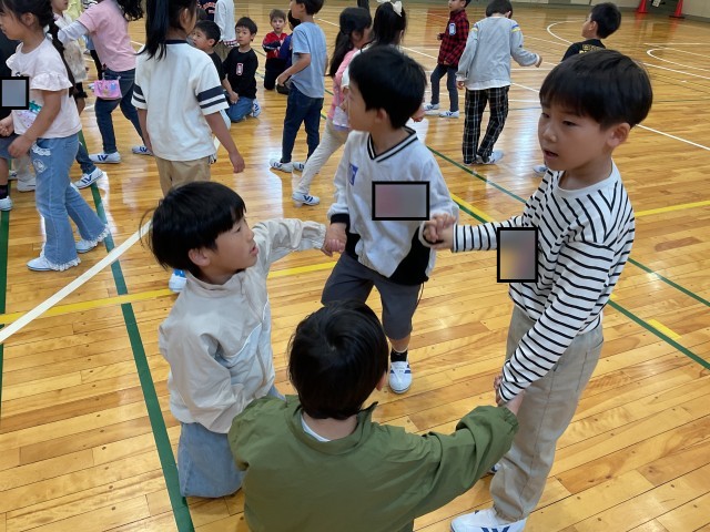 最後はみんなで集合ゲーム。音の鳴った数だけ友達と手をつないで座ります。