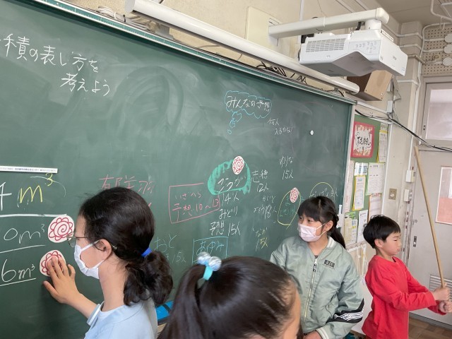 算数で1立方メートルは100万立方センチメートルと学習しました。前時の学習で使った1立方センチメートルのブロックが100万個分!想像できませんね。「どんな大きさなんだろう」とみんなで1メートルの棒を使って、1立方メートルを作ってみました。さあ、その中に何人子どもたちが入れたでしょう・・・予想が当たった子もいますよ。