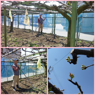 朝からぽかぽか、とても暖かい日になりました。梨園では梨名人さんが、草取りをしてくださっています。「梨の花が咲くのは、いつもよりちょっと遅いかもしれない。」ということでした。