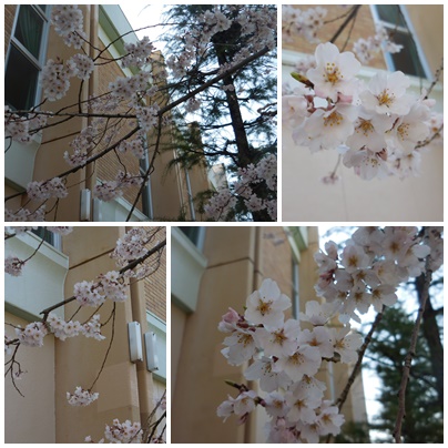 体育館の北側にはソメイヨシノよりひとまわり小ぶりな花をつける桜の木があります。