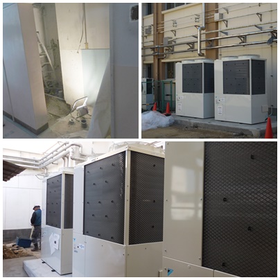 南館と機械室の間、北館と配膳室の間に、それぞれエアコンの室外機が設置されました。