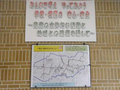 平成29年度のスタートにあたり、正面玄関の壁面に、研究テーマと子ども・教職員・保護者が協力して作成した校区安全マップを掲示しました。