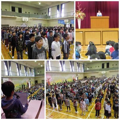 その後、3年生と6年生の代表児童から「今年頑張りたいこと」についての作文発表があり、最後に628名全員で元気に校歌を歌って始業式を締めくくりました。