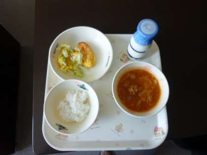 牛乳  ごはん  トマトなべ  オムレツ  春のサラダ