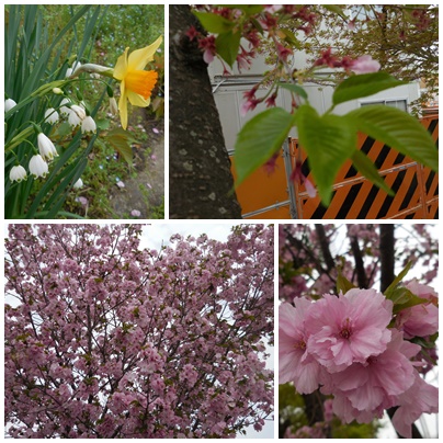 かわって正門の南の八重の桜は今が満開。残念ながら今日の雨で散り始めてしまいそうです。