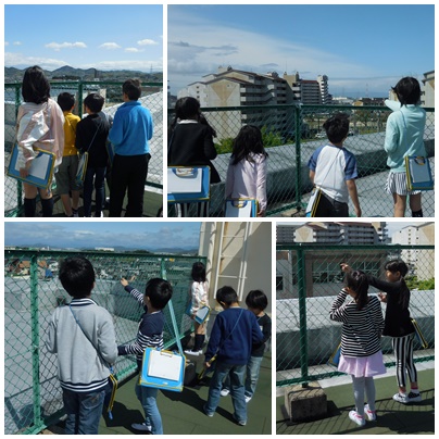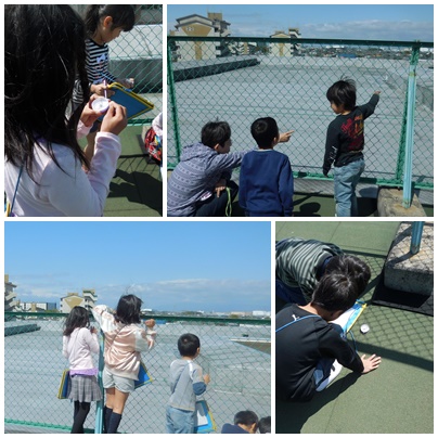初めて見る景色に大興奮しながら、どちらの方角に何が見えるか、友だちと確認して記録しています。