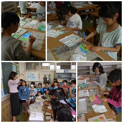 絵の具を使って、色づくりをしたり、様々な技法を覚えてきれいな模様を描きます。