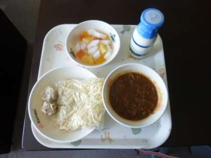 本日の給食 中華めん 牛乳 五目ジャジャめん しゅうまい 杏仁豆腐