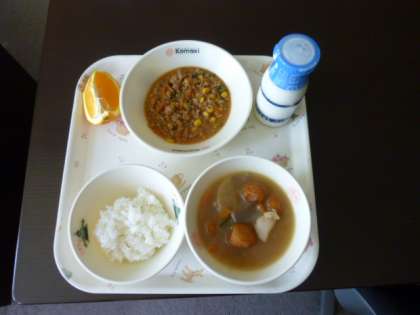 本日の給食 ごはん 牛乳 関東煮 納豆みそそぼろ オレンジ