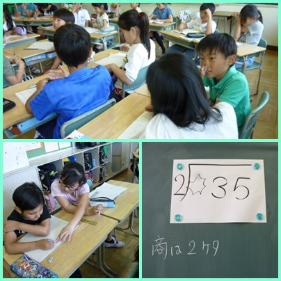 4年生の算数「わりざんのひっ算」の学習です。「割り算のひっ算の問題が一部わからなくなっています。ヒントをもとに不明の部分の数字を考えましょう」という内容です。普通に計算するのではないので、習ってきたことを生かして知恵を出し合って考えます。考える力がきたえられていきます。