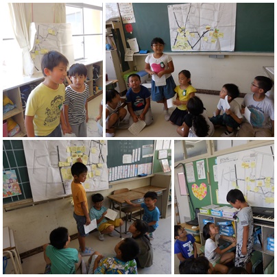 まちたんけんに出かけて見つけてきたこと、気づいたことをグループごとに発表する練習をしています。