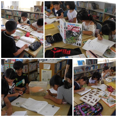 運動場の草むらを歩いて昆虫探しをして観察した後は、図書室で図鑑などを使って昆虫について調べてみます。
