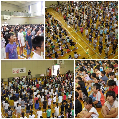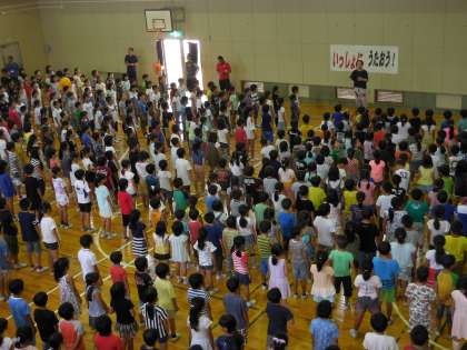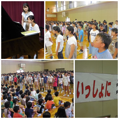朝からかなり蒸し暑く、汗をかきながらの合唱でしたが、先月から朝の会や音楽の授業で練習してきた「フレンドシップ」をみんなで歌いました。