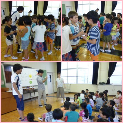 1年生の英語活動です。あいさつをして、カードを交換しています。楽しく英語活動をしています。