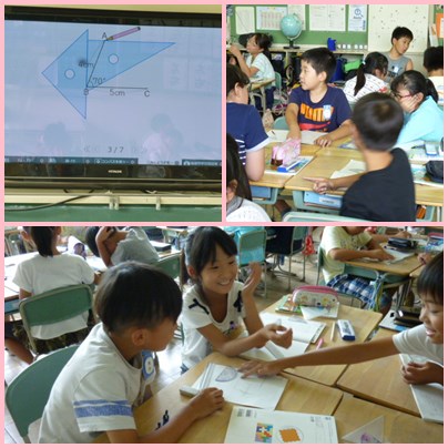 4年生は、算数で「平行四辺形」について学んでいます。コンパスを使ったかきかたと三角定規を使ったかきかたを考えてかいています。平行四辺形とよく似た「ひし形」との違いについても考えました。