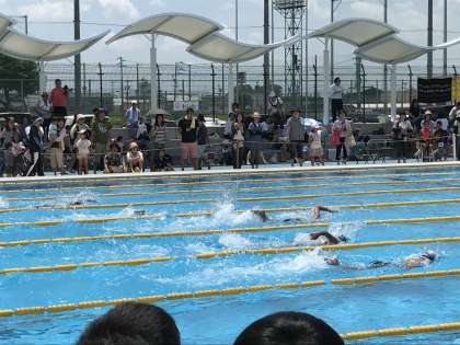 本日は、南スポーツセンターのプールで市内小中学校の水泳大会が行われました。一色小学校の水泳部もこれに出場しました。それぞれ、自己ベストを更新しようと、一生懸命泳いでいました。