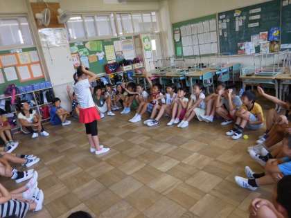 4年生のクラスでは、お楽しみ会で楽しそうにゲームをしています。