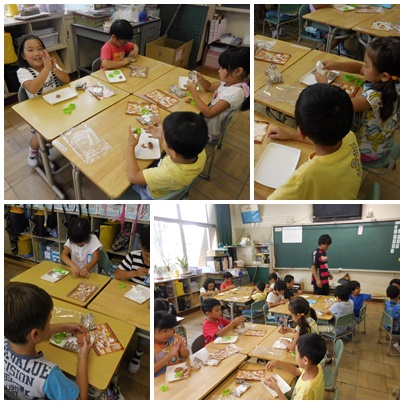 白い粘土を三角にして「おにぎり!」、茶色の粘土を平らにのばして型抜きして「クッキー!」、2色の粘土を混ぜ合わせて・・・