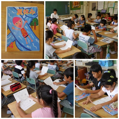 4年生の教室でも、夏休みの課題を配布してもらい、説明を聞いています。
