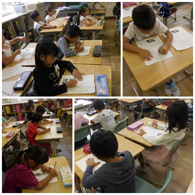 「消しゴムを使わない」などいつもとはちょっと違った約束の中で、お手本を見ながら丁寧に書きます。