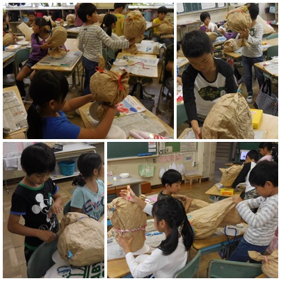 図工競技会の課題として、くしゃくしゃにした紙の変化を楽しみながらお気に入りの「友だち」をつくる制作をしています。