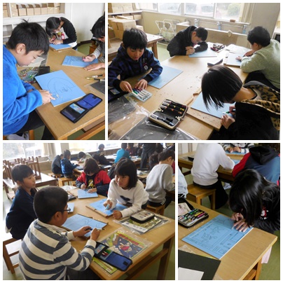 白黒での版画制作の経験しかない子どもたちは少々戸惑い気味のようです。