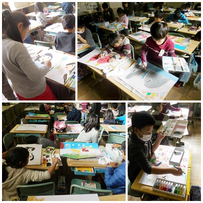 昔話や国語の授業で習った物語など、自分の好きなお話の一場面を想像して、クレヨンや水彩絵の具で描いていきます。