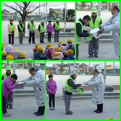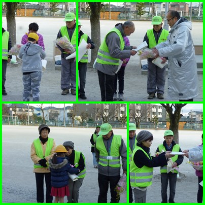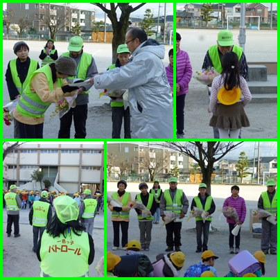 一色小のパトロールボランティアさんは、25名です。その内、6名の方が12月いっぱいでやめられます。そこで、今日の1年下校のときに、校長先生から感謝状をお渡しして、1年生の代表児童から花束をお渡ししました。