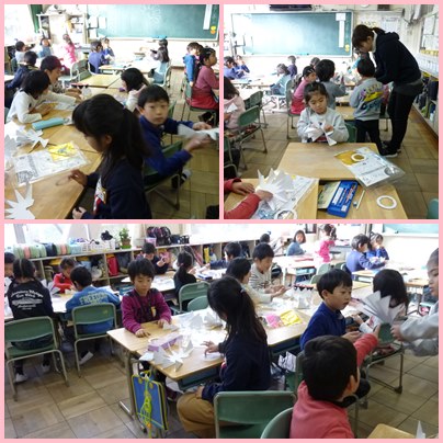 1年生の図工「クルクル まわして」の様子です。風で回る仕組みを基に、楽しく遊ぶものをつくります。風で回る動きを見て、風で回る仕組みのつくり方を知り、組み立てていきます。ちゃんと回るといいね。