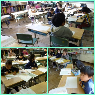 1年生は、国語で「てがみをかこう」の学習をしています。誰に、どんな内容で書くのかを考えて書きます。