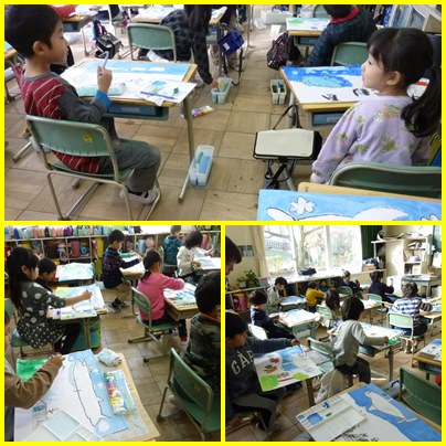 1年生の図工です。お話の中の大好きな場面を思い浮かべて、絵に表わします。絵の具で丁寧に着色します。