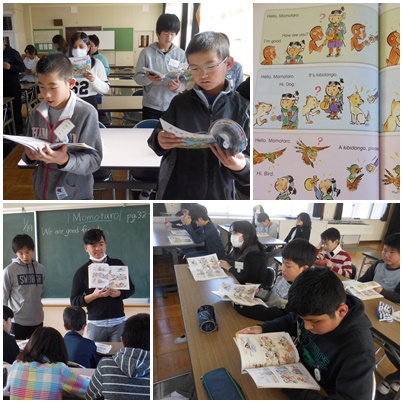 昔話の「桃太郎」を簡単な英語劇にしたものを読んでいます。