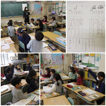 今日は、身の回りのものを思い浮かべながらものの名前のグループ分けをして、上位語と下位語の関係を学んでいます。