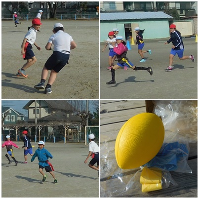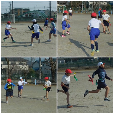 タグを奪うときに「タグ!」と叫ぶことや、タグをとられそうなときにタグをおさえて防いではいけないことなど、タグラグビーのルールを取り入れたおにごっこです。