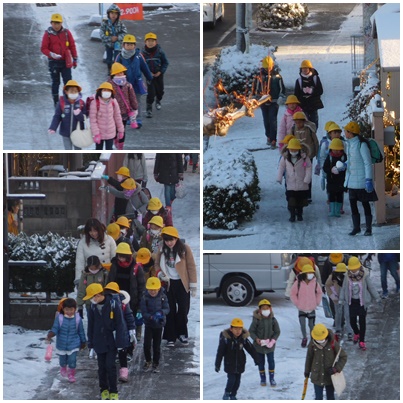 集合場所でひとしきり雪と戯れてから登校した班もあるようで、いつもより少々学校到着が遅い班もありました。