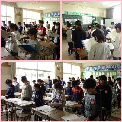5年生は、音楽で歌の練習です。祝う会や卒業式に向けて、美しい声で歌えるように練習しています。
