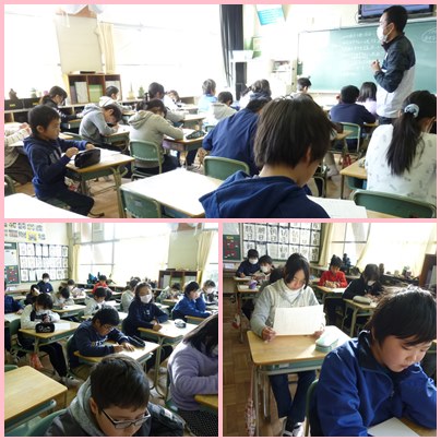 5年生の国語の学習です。スピーチメモを書きます。委員会やクラブのことなどを題材に、内容を整理し、スピーチメモにまとめています。原稿を推敲し、よりよい表現に直します。