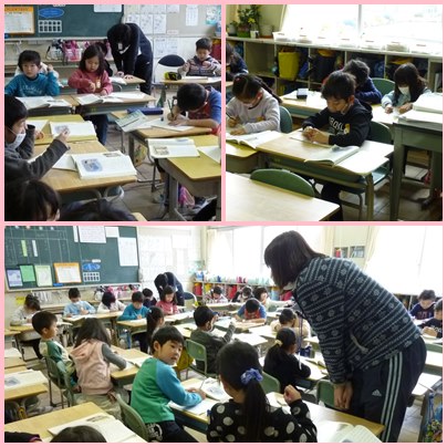 先週、学級閉鎖だった1年3組ですが、今週から元気よく登校です。国語「たぬきの糸車」の学習をしています。たぬきとおかみさんの様子を読んで、書き込みシートに書いていきます。