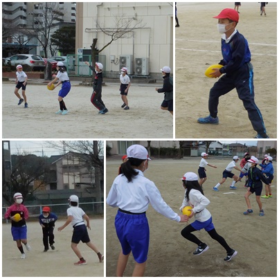 ゴール型ゲームの学習としてタグラグビーを行っています。