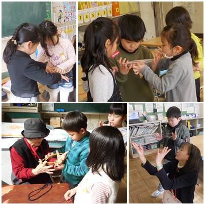 竹とんぼ、羽子板、けん玉、折り紙、お手玉、あやとりの中から前半・後半で1つずつ体験しました。
