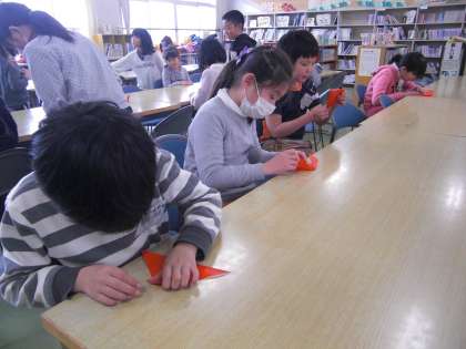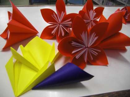 卒業式・入学式に体育館の壁に飾る作品の制作1回目です。赤・紫・緑・黄の折り紙で花びらの一片を折りました。