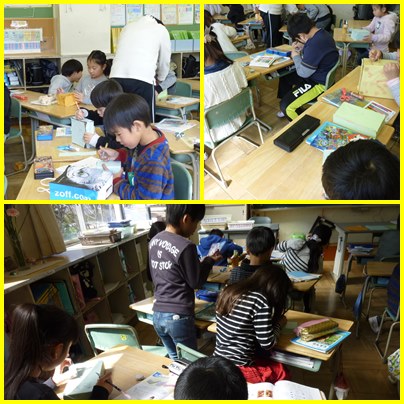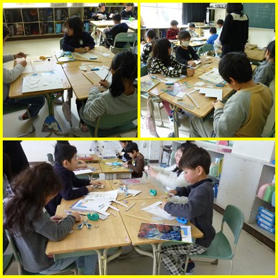2年生の算数の学習です。はこの形について学びます。2枚ずつの紙を組み合わせて箱を作ったり、はこの面は、どの部分かを確認したりしています。