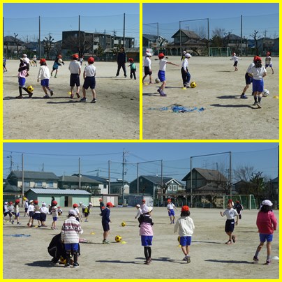 1年生の体育「サッカー」です。ボールを蹴ったり、チームで動きを練習したりして、ちょっぴり汗ばむほどの天気の中、体を動かしました。